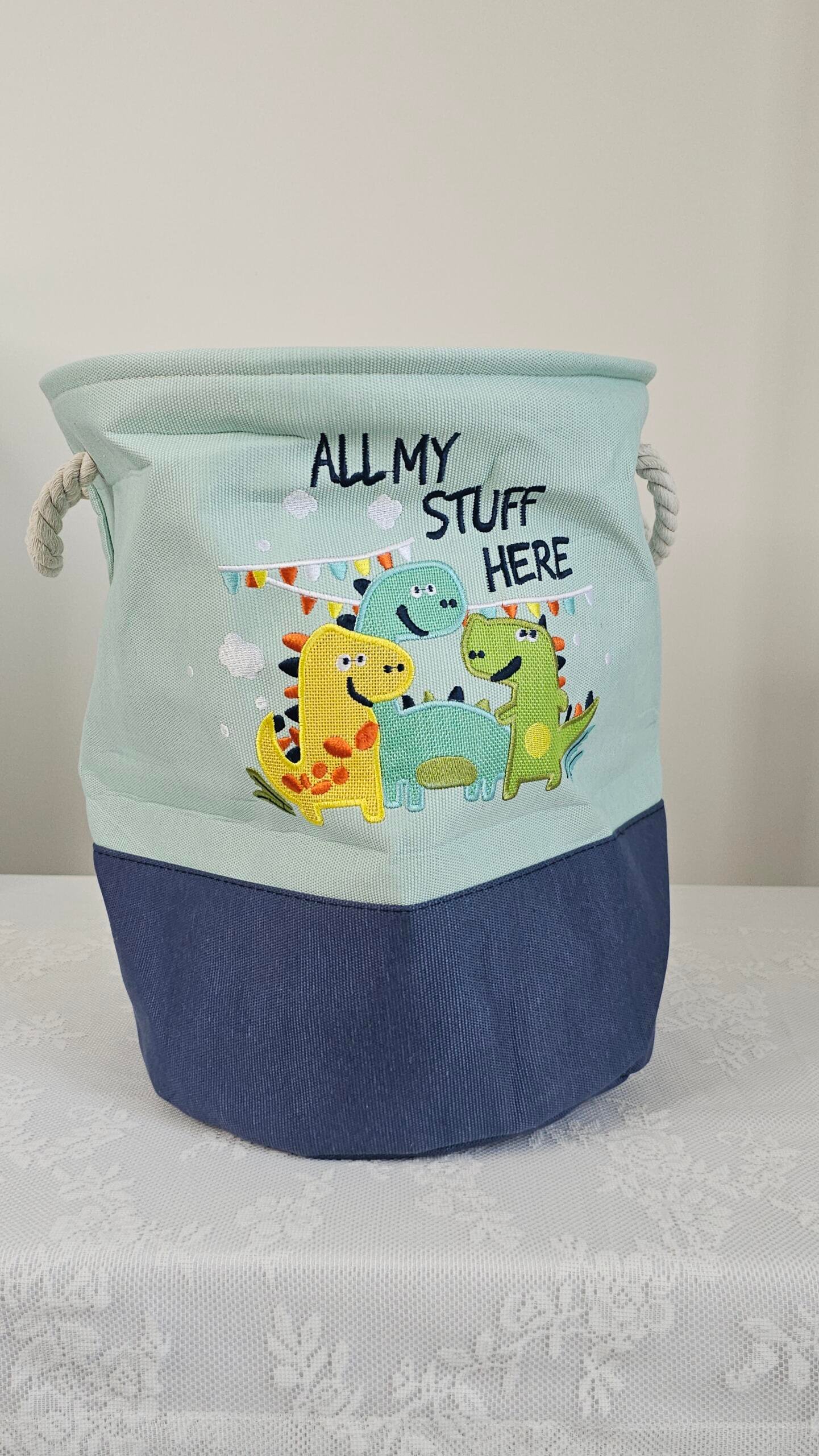 A sturdy light blue linen basket decorated with adorable green, turquoise, and yellow dinosaur prints. Featuring durable rope handles, this basket is perfect for laundry or storing toys — combining fun design with strong, reliable build for everyday use.