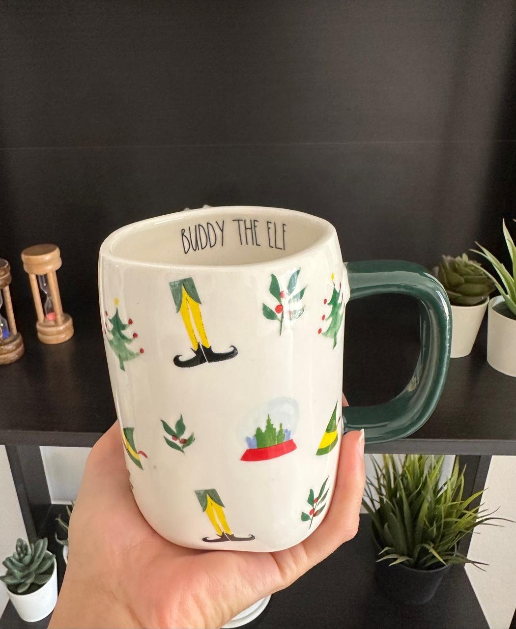 A large off-white mug with a green handle, featuring playful illustrations of a jester’s legs and hat. With a capacity of approximately 450 ml, it’s perfect for coffee, tea, or any warm beverage, bringing festive cheer and fun to your winter moments.